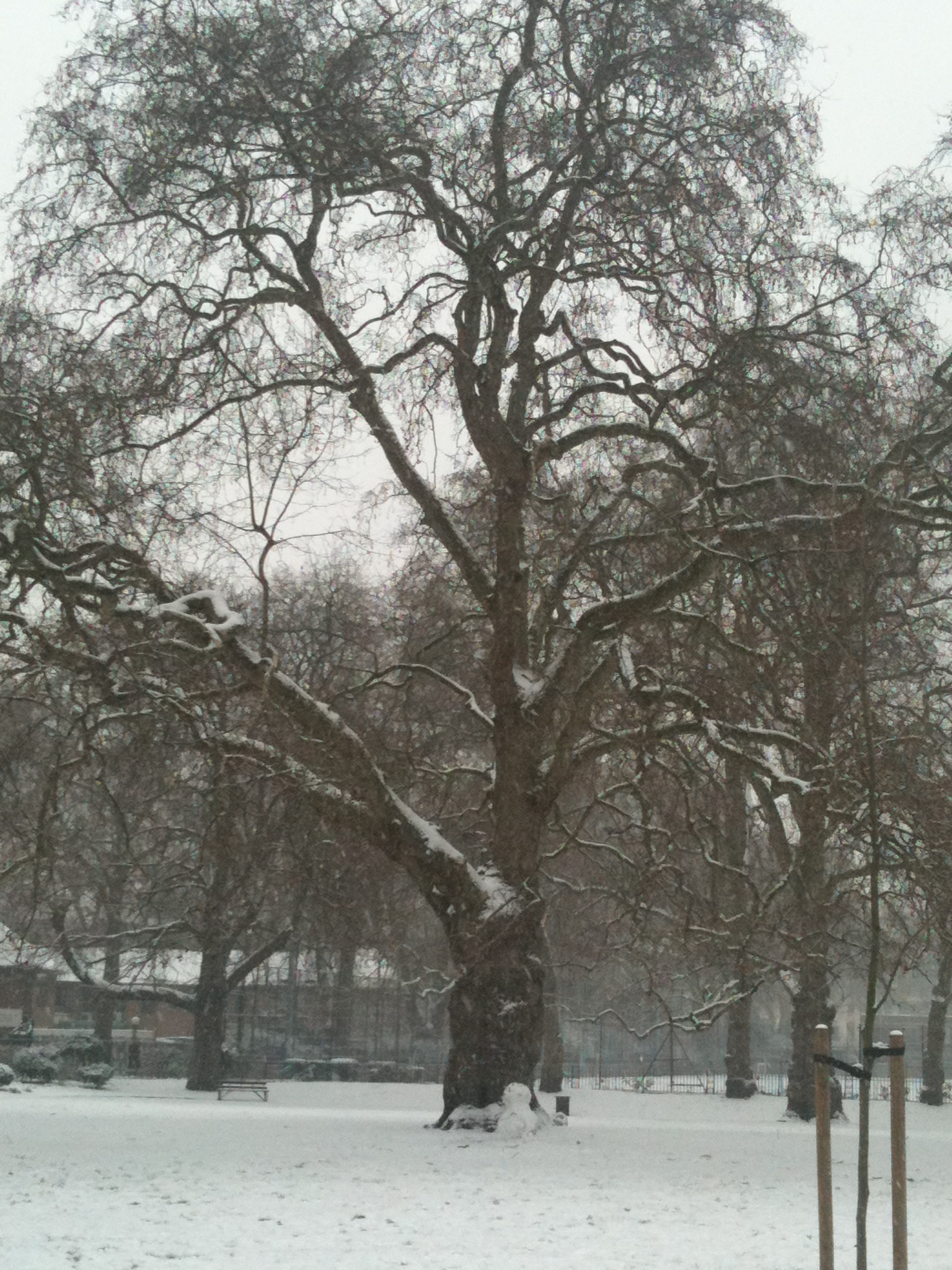 The snow is falling and people are having fun, making tracks and sculptures. . .