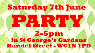 You are invited to Friends of St George’s Gardens free Summer Party on Saturday, 2 till 5pm. We’re looking forward to welcoming you with music, a children’s entertainer, Punch and Judy, face painting, a Bollywood dance workshop, a community choir, second hand books, and – of course – tea and cakes. Do come, and bring friends and neighbours. It may not be quite as summery as we would like but still come and enjoy!