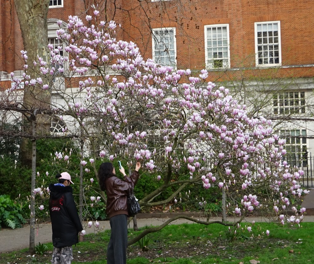 It’s hard to resist whipping out the phone and sharing photos of this lovely magnolia in Tavistock Square! There are other blossoms just coming out too, one example spotted peeping over the hedge in Brunswick Square this morning opposite International Hall.